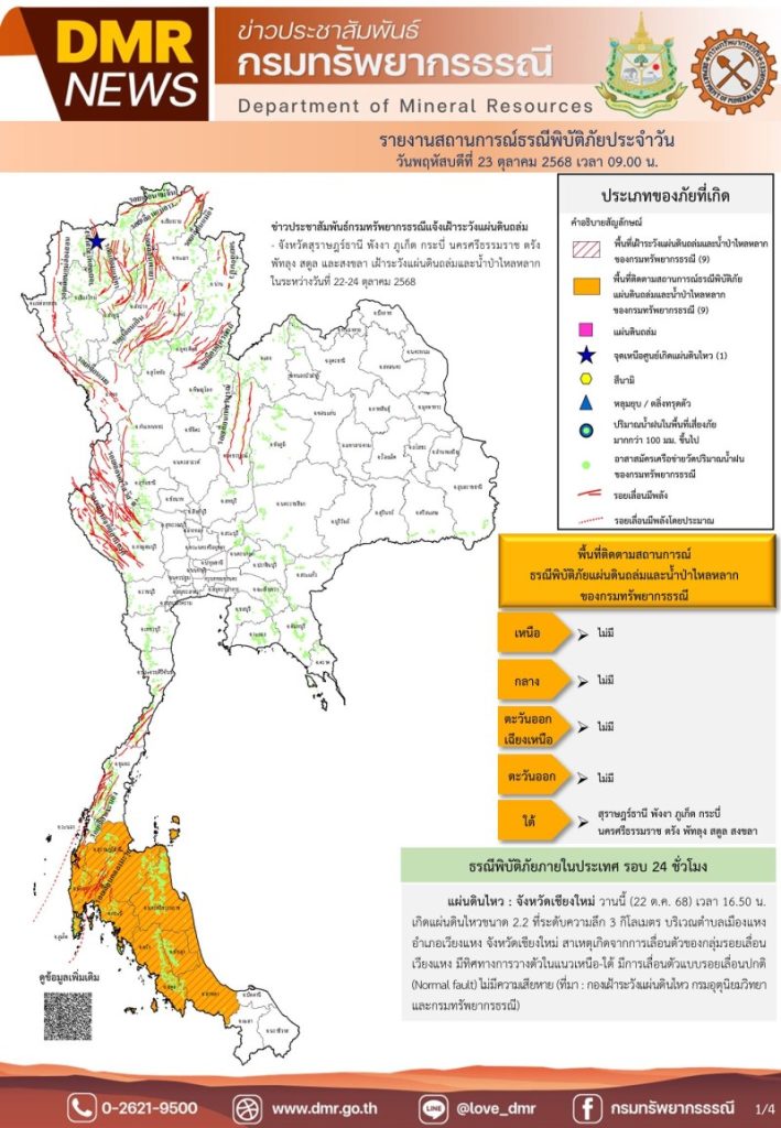 เมื่อวันที่ 23 ตุลาคม 2568 ศูนย์ปฏิบัติการธรณีพิบัติภัย กรมทรัพยากรธรณี กระทรวงทรัพยากรธรรมชาติและสิ่งแวดล้อม ออกประกาศแจ้งเตือนให้เฝ้าระวังสถานการณ์แผ่นดินถล่ม และน้ำป่าไหลหลาก ในพื้นที่ 9 จังหวัด ได้เเก่ จังหวัดสุราษฎร์ธานี พังงา ภูเก็ต กระบี่ นครศรีธรรมราช ตรัง พัทลุง สตูล และสงขลา ทั้งนี้ มีรายงานพบ แผ่นดินไหว 1 เหตุการณ์ ในพื้นที่จังหวัดเชียงใหม่