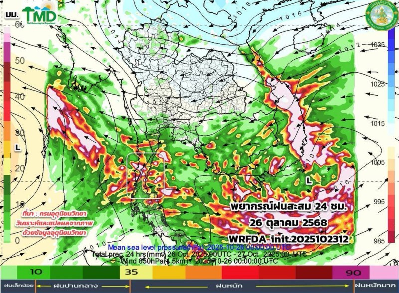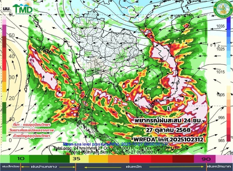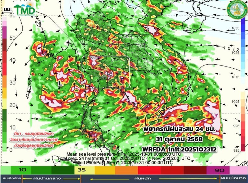 เมื่อวันที่ 24 ตุลาคม 2568 ศูนย์ประชาสัมพันธ์กรมอุตุนิยมวิทยา ประกาศผลการพยากรณ์ฝนสะสมรายวัน ผ่านเพจเฟซบุ๊ก กรมอุตุนิยมวิยา โดยระบุว่า อัปเดตผลการพยากรณ์ฝนสะสมรายวัน (ทุก ๆ 24 ชม. นับตั้งแต่ 07.00 น. ถึง 07.00 น.วันรุ่งขึ้น และลมที่ระดับ 850hPa 1.5 กม.10 วันล่วงหน้า ระหว่าง 24 ต.ค. – 2 พ.ย. 68 จากแบบจำลองของกรมอุตุนิยมวิทยา (TMD-WRFDA) เฉดสีแสดงถึงปริมาณฝน (มม.) สีเขียวฝนเล็กน้อย สีแดงหมายถึงฝนหนัก (มากว่า