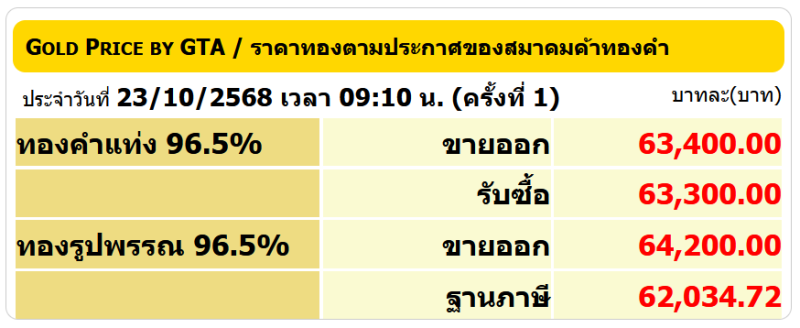 ราคาซื้อขายทองคําในประเทศชนิด 96.5% วันจันทร์ ที่ 23 ตุลาคม 2568 (ประกาศครั้งที่ 1)
