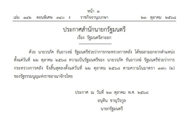 เว็บไซต์ราชกิจจานุเบกษา เผยแพร่ประกาศสำนักนายกรัฐมนตรี เรื่องรัฐมนตรีลาออก โดยมีนายอนุทิน ชาญวีรกูล นายกรัฐมนตรี เป็นผู้ลงนาม ประกาศ ณ วันที่ 23 ต.ค. 68