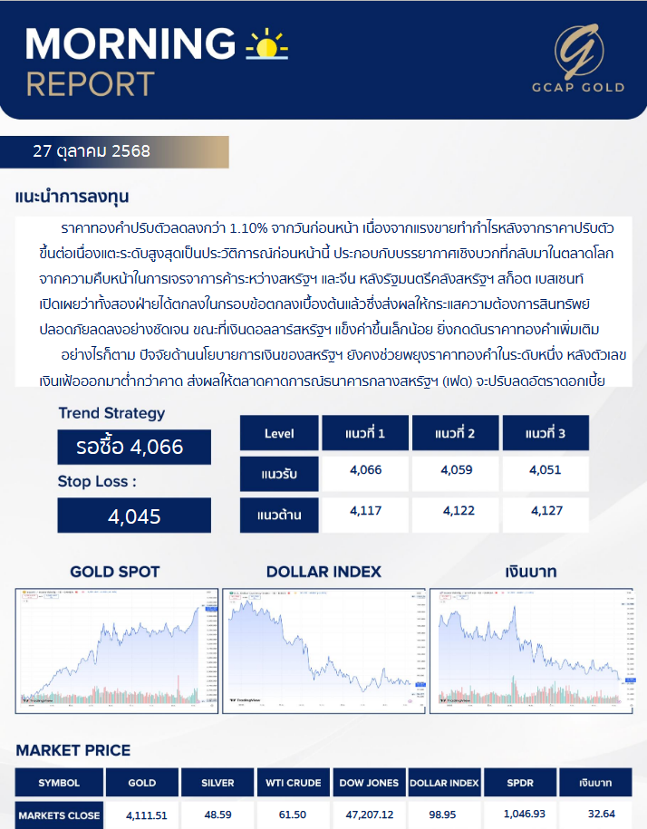 เเนะนำการลงทุนด้านทองคำ รอบเช้าวันนี้ 27 ตุลาคม 2568 โดย บริษัท จีแคป จำกัด ราคาทองคำปรับตัวลดลงกว่า 1.10% จากวันก่อนหน้า เนื่องจากแรงขายทำกำไร หลังจากราคาปรับตัวขึ้นต่อเนื่อง แตะระดับสูงสุดเป็นประวัติการณ์ก่อนหน้านี้ ประกอบกับบรรยากาศเชิงบวกที่กลับมาในตลาดโลก